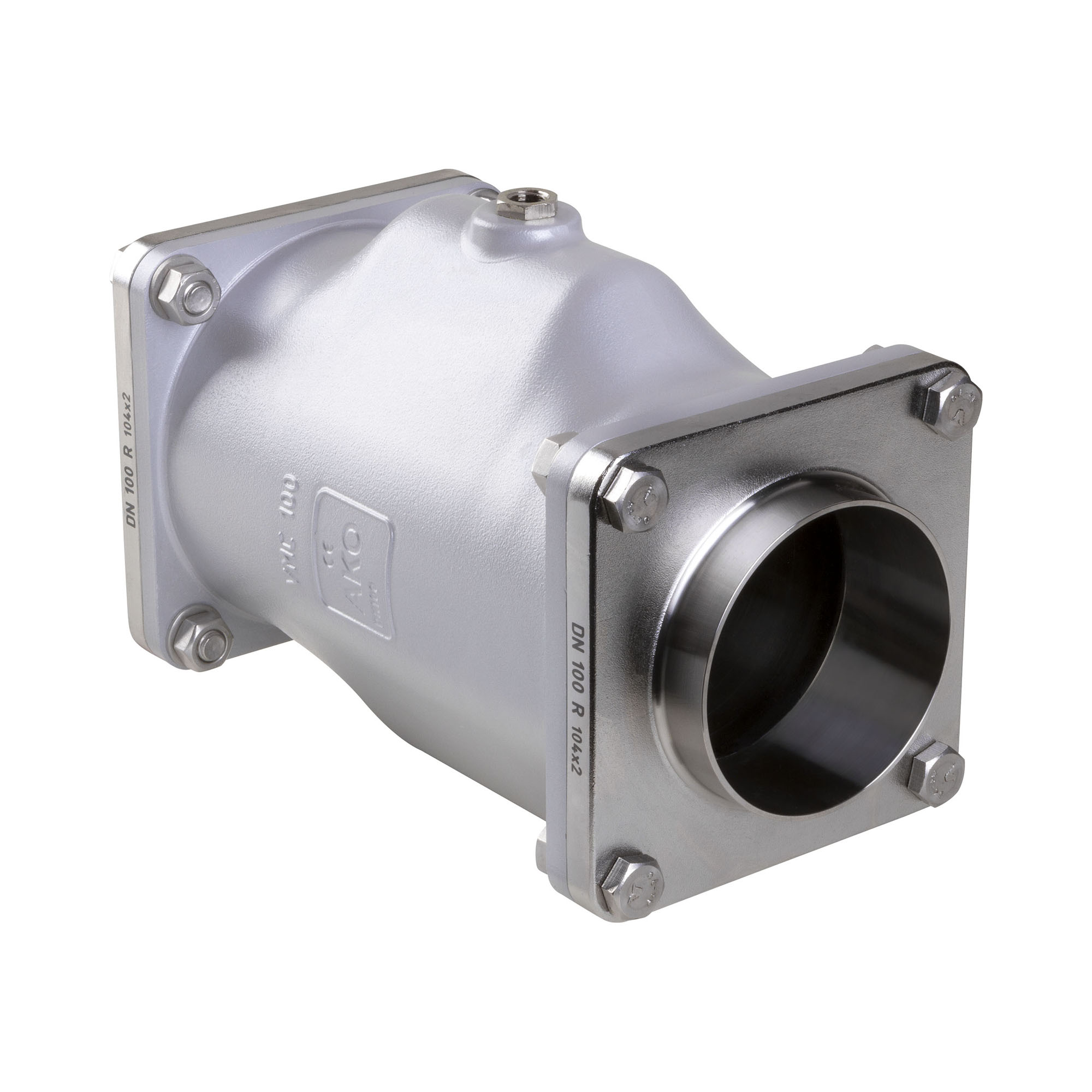 AKO Air operated Pinch Valve, weld-on ends, DN100. Body made of: Aluminum AlSi10Mg, Connections made of: Stainless Steel 1.4404. Sleeve made of: Natural rubber high temperature.