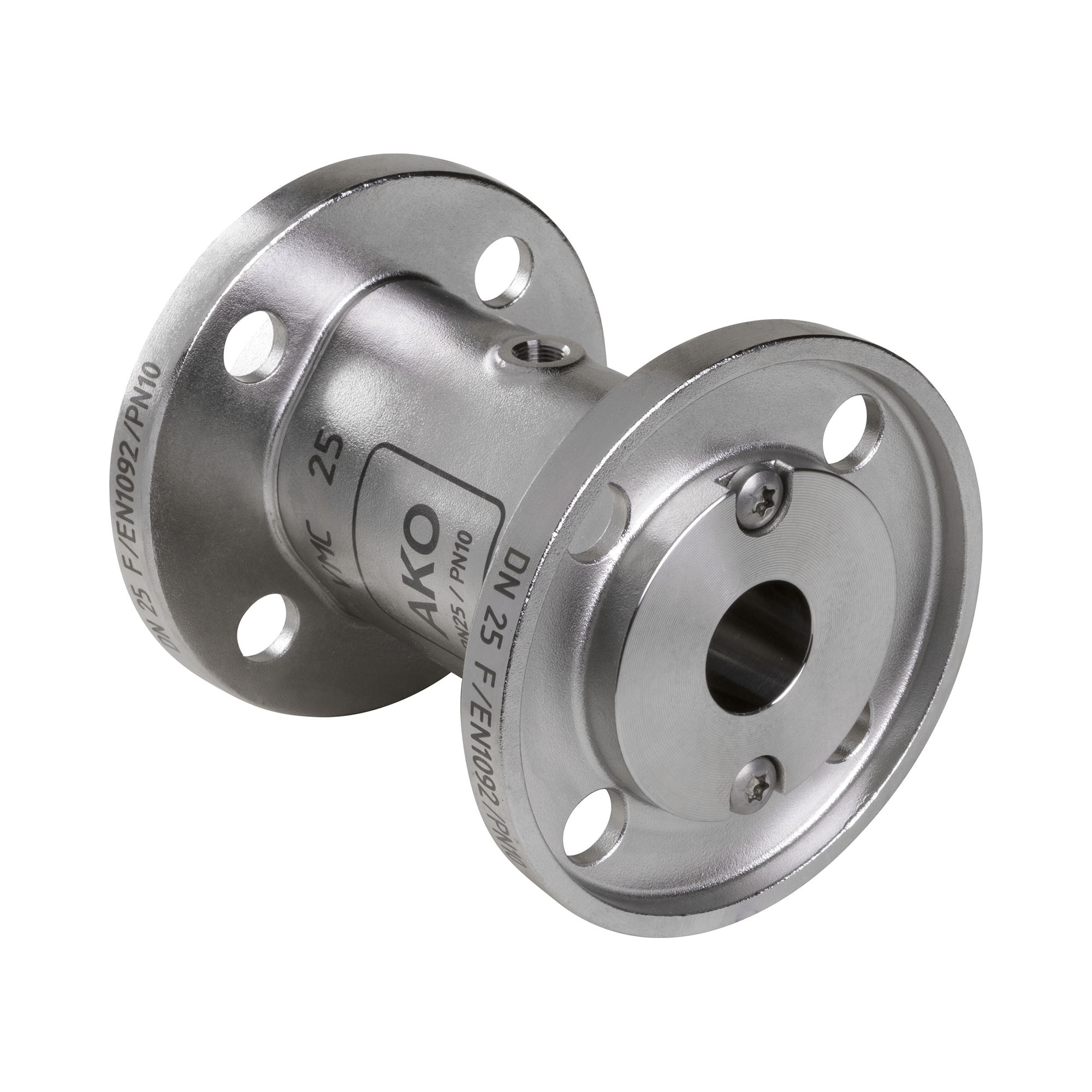 AKO Air operated Pinch Valve, flange connection, DN25. Body made of: Stainless Steel 1.4408, Connections made of: Stainless Steel 1.4404. Sleeve made of: EPDM HTEC medium contact food black.