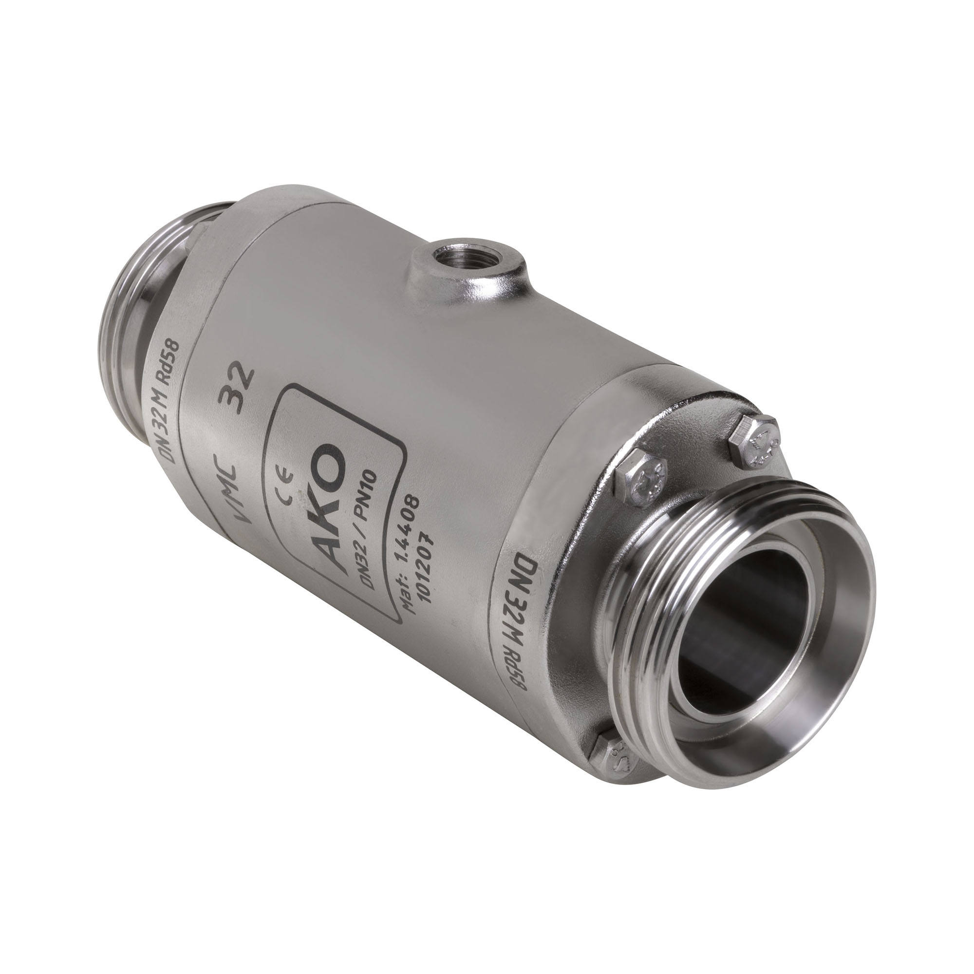 AKO Air operated Pinch Valve, threaded spigot (dairy pipe thread),DN32. Body made of: Stainless Steel 1.4408, Connections made of: Stainless steel 1.4404. Sleeve made of: EPDM HTEC medium contact food black.
