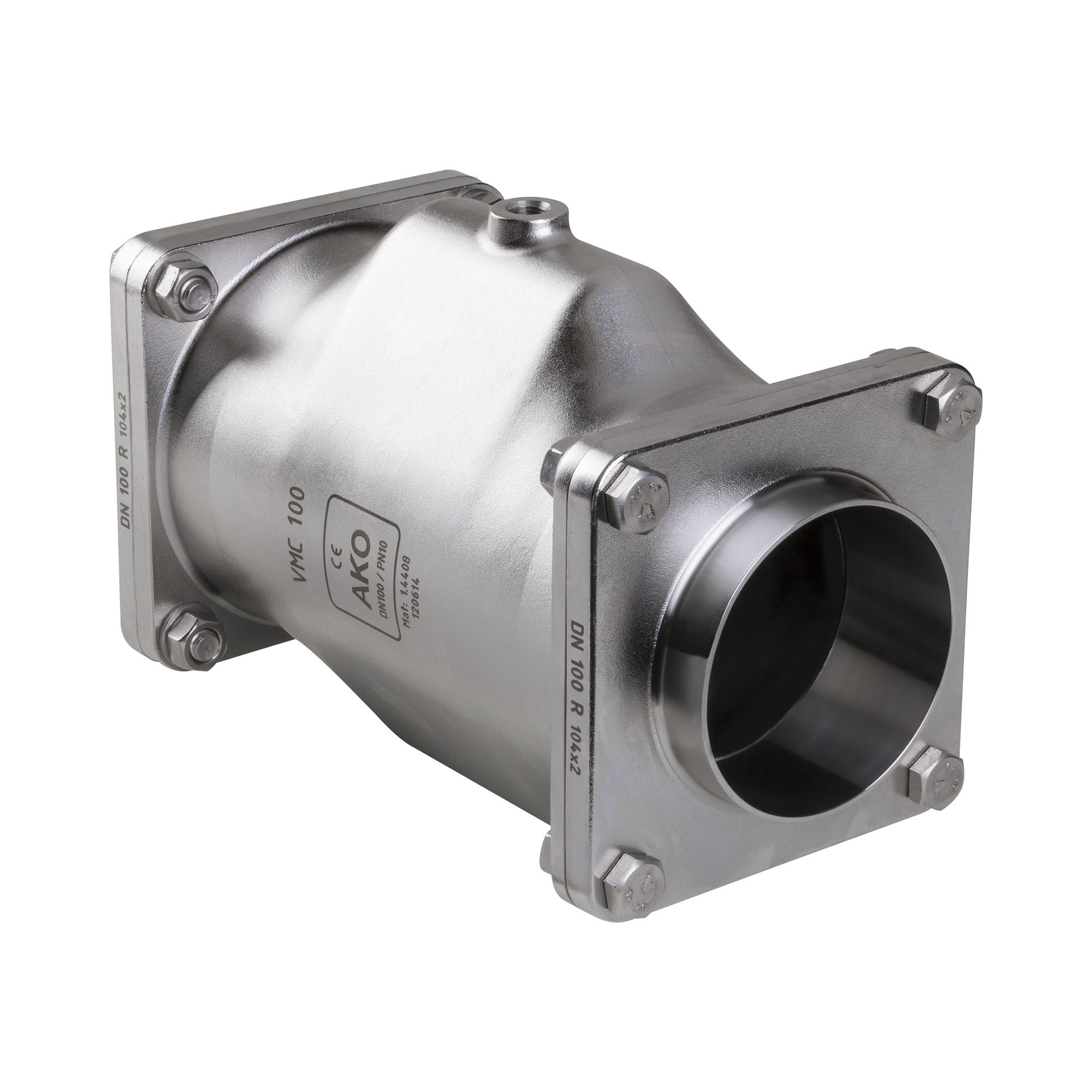 AKO Air operated Pinch Valve, weld-on ends, DN100. Body made of: Stainless Steel 1.4408, Connections made of: Stainless Steel 1.4404. Sleeve made of: Natural rubber high temperature.