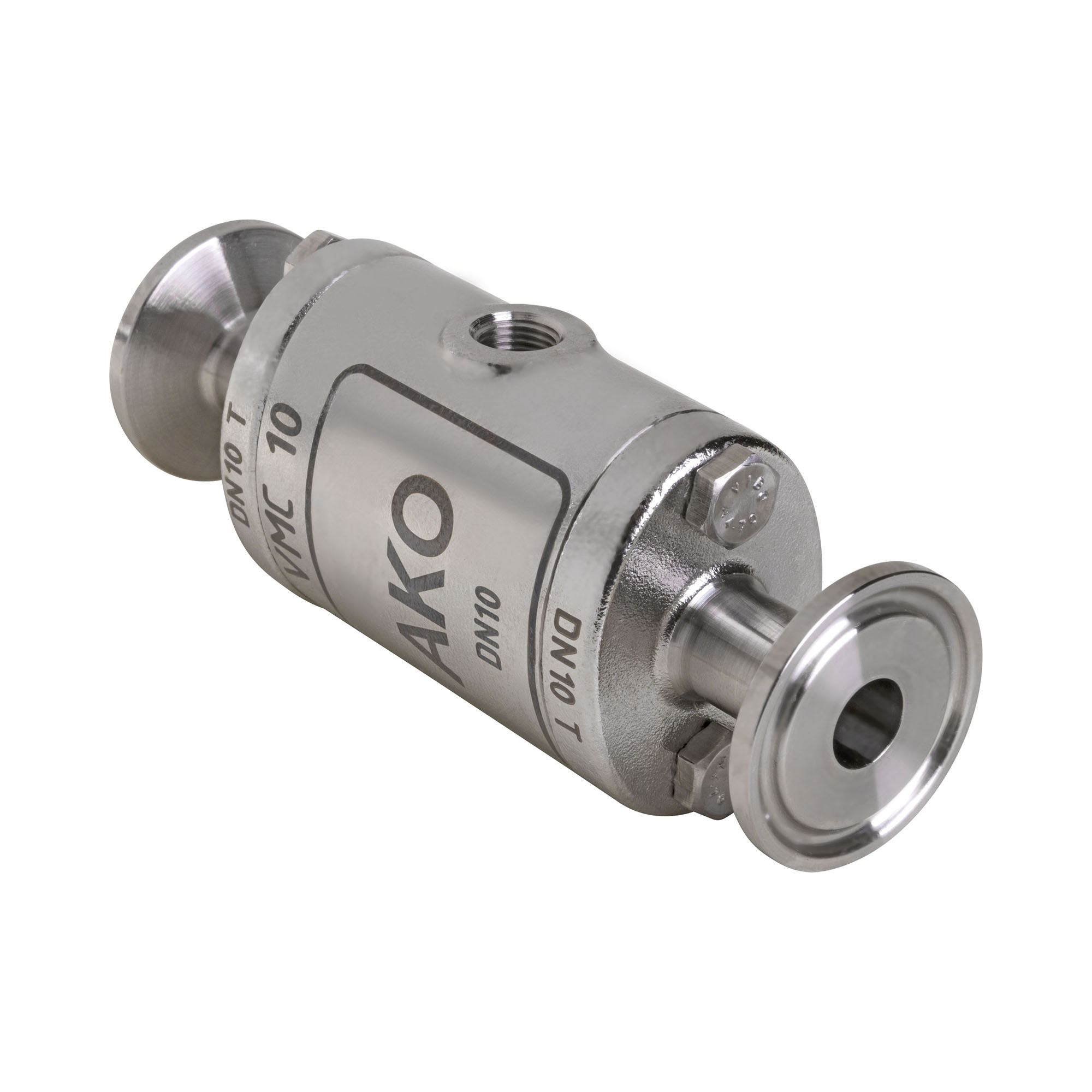 AKO Air operated Pinch Valve, tri-clamp connection, DN10. Body made of: Stainless Steel 1.4408, Connections made of: Stainless Steel 1.4404. Sleeve made of: Viton.
